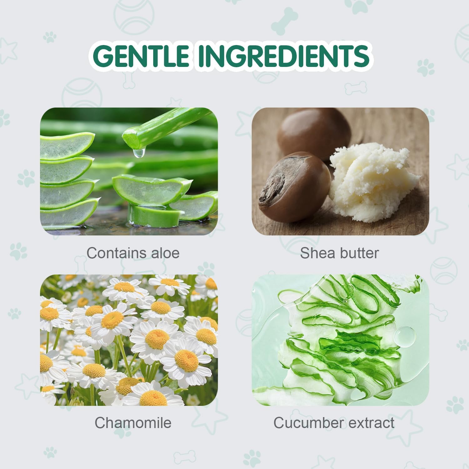 GENTLE INGREDIENTS: Contains aloe, shea butter, chamomile and cucumber extract, helping clean, refresh and condition while giving the coat a healthy shine. Perfect for wiping away odor, dirt and dander from paws, body and bottom between baths.