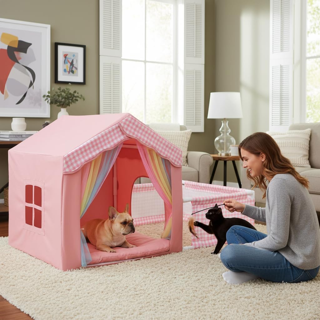 A Haven of Comfort & Security: We understand that pets need a place to call their own. This enclosed kennel provides a secure, den-like environment that helps ease anxiety for nervous or shy pets. It’s the perfect retreat during thunderstorms, fireworks, or when you have guests over, giving your pet a sense of peace and privacy.Effortless Cleaning for a Healthier Home: Pet ownership should be joyful, not messy. That’s why we designed this dog house for easy maintenance. The soft, plush cushion is fully removable and machine washable, and the interior can be quickly wiped clean. Spend less time on chores and more time cuddling!Built to Last with Safety First: Your pet’s well-being is our top priority. We use only durable, non-toxic materials to ensure this house stands up to everyday use. The reinforced structure and non-slip bottom prevent sliding on hard floors, ensuring a stable and safe space for your pet to play and rest.Stylish Design Meets Functional Living: Who says pet supplies can’t be chic? This lovely pink dog house is crafted to complement your home decor beautifully. Place it in your living room, bedroom, or office—it blends in seamlessly, looking less like a kennel and more like a stylish piece of pet furniture.The Perfect Gift for Pet Lovers: Looking for a unique and thoughtful gift for a dog or cat owner? Look no further! This dog house arrives with easy, tool-free assembly, meaning the joy can begin in minutes. It’s the ultimate gift for birthdays, holidays, or “just because,” guaranteed to earn you a wagging tail of thanks.