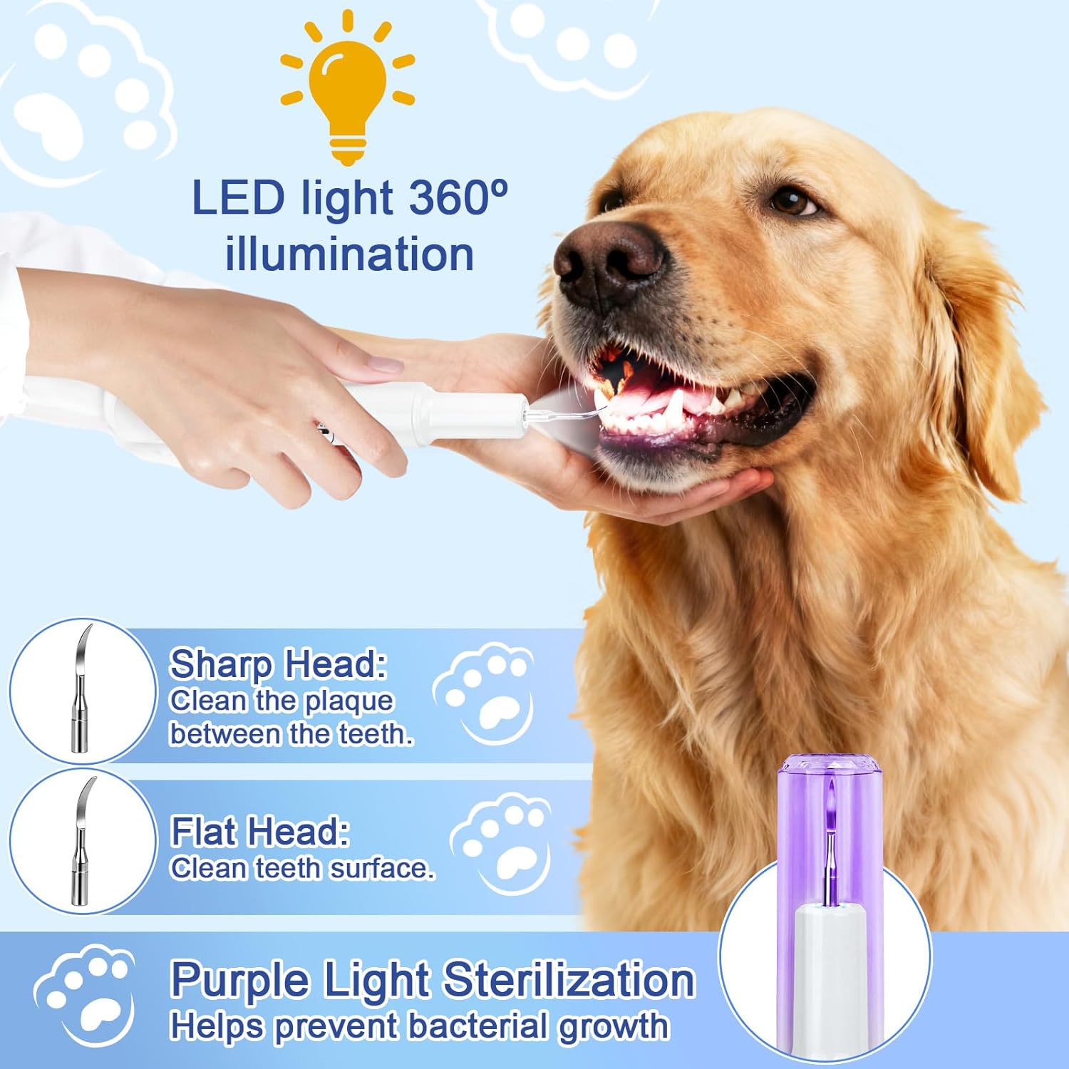 High-Frequency Vibration Cleaning: Our low-noise tartar remover for teeth uses 40kHz high-frequency vibration technology to effectively remove stubborn plaque, tartar, and stains from your dog’s teeth. Say goodbye to unsightly teeth and bad breath for your beloved pet.