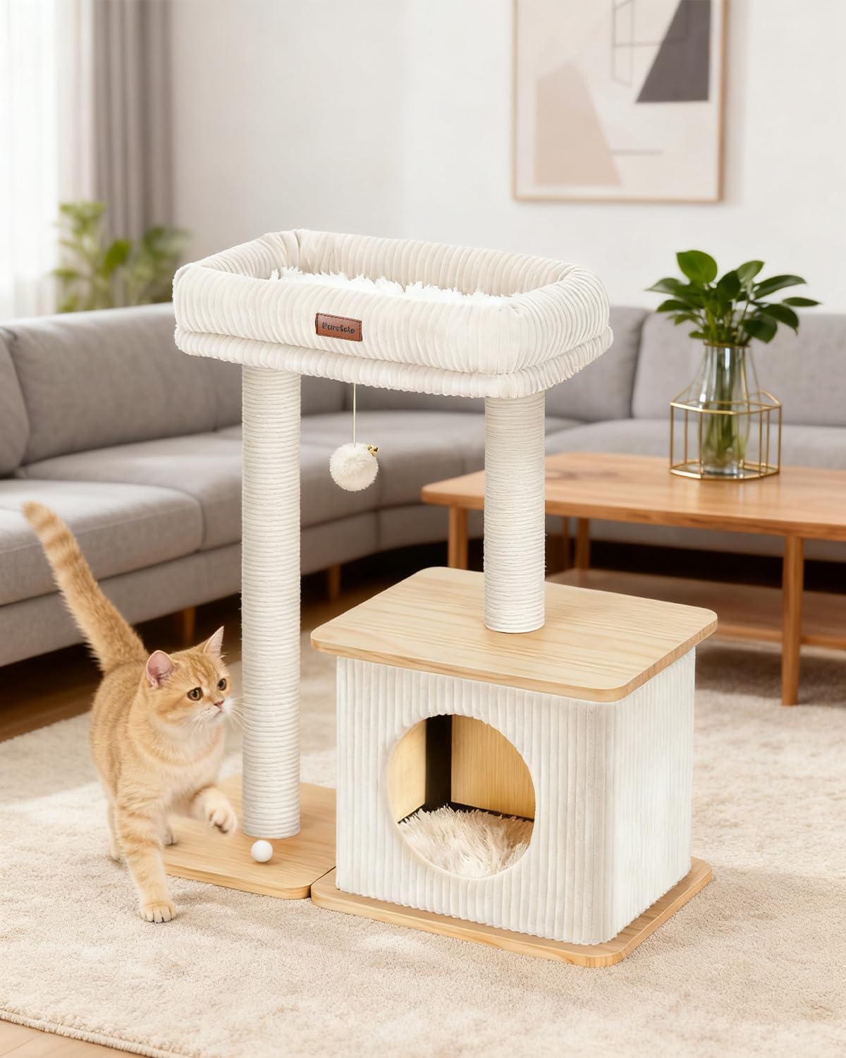 I’m extremely happy with this cat tree. I wanted something functional for my cats that didn’t look bulky or cheap, and this modern Nordic-style design fits beautifully into my home. The walnut finish looks very nice and blends well with modern decor instead of standing out like a typical cat tower.Assembly was straightforward, and all the pieces lined up correctly. Once assembled, the structure feels very solid and stable, even with active cats climbing and jumping on it. The floor-mounted design adds extra stability, which I really appreciate.My cats immediately took to it. The padded beds are soft and comfortable, and the cozy condos give them a secure place to rest. The sisal scratching posts are thick and durable, and my cats prefer them over other scratching surfaces in the house.Overall, this is a well-made, attractive, and practical cat tree that works well for both kittens and adult cats. It provides multiple lounging and scratching options while maintaining a clean, modern look. I’m very satisfied with the quality and would definitely recommend it.
