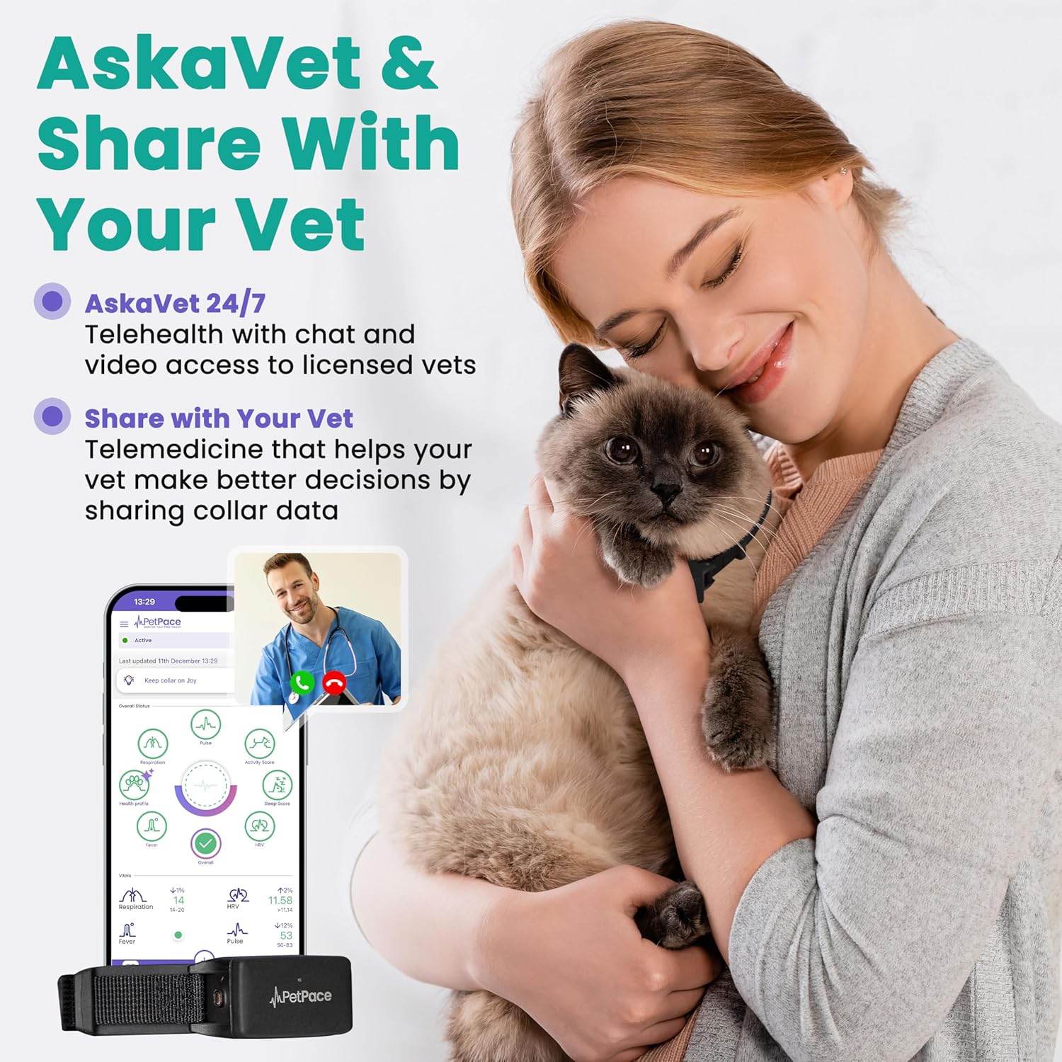 TELEHEALTH – AskaVet & Share With Your Vet gets you 24/7 Telehealth access to licensed vets via chat or video. Enable Remote Consultation and Telemedicine – AskaVet allows a vet to continuously track collar data. SHARE WITH YOUR VET Easily share AI health reports to help your vet make better treatment decisions. All data is securely stored in the PetPace App. Telehealth connects to a licensed vet via chat or video for general consults.