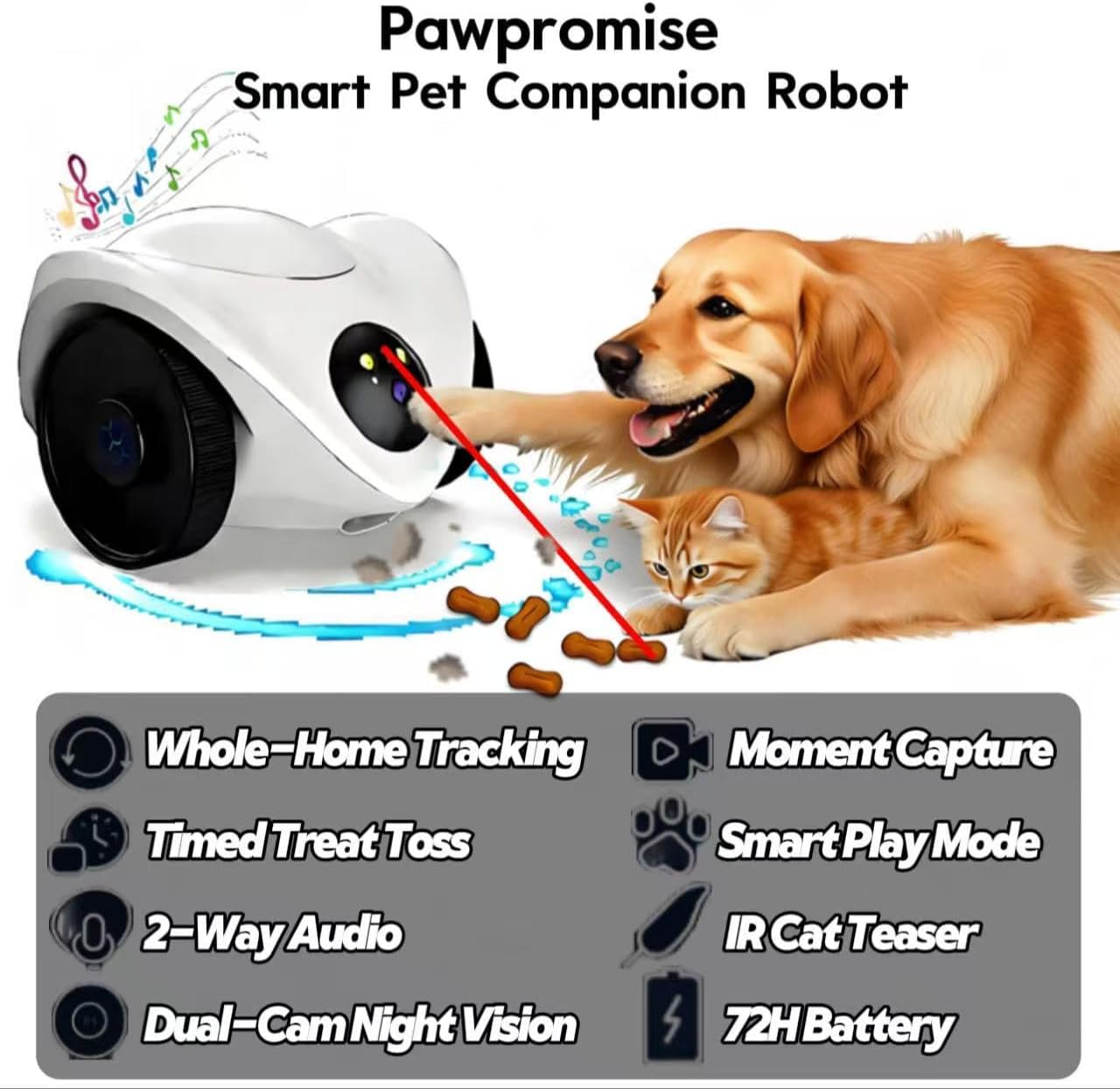 Smart Whole-Home Mobility: Compact 265235178mm, lightweight 500g, with wheel system for free movement throughout your home. Dual Camera & Night Vision: 3MP HD camera, wide-angle lens, intelligent night vision for day and night clarity. Remote Interaction: Built-in microphone and speaker support two-way audio calls to interact with your pet anytime. Treat Feeding: Remotely dispense treats via mobile app to keep pets happy and healthy. Social Sharing & Recording: Capture and share every adorable pet moment, satisfying emotional and social needs. Battery & Convenience: 10,000mAh polymer battery for long-lasting use, USB rechargeable. Premium Craftsmanship: Elegant design with high-quality materials, seamlessly integrates into home decor while showcasing smart technology