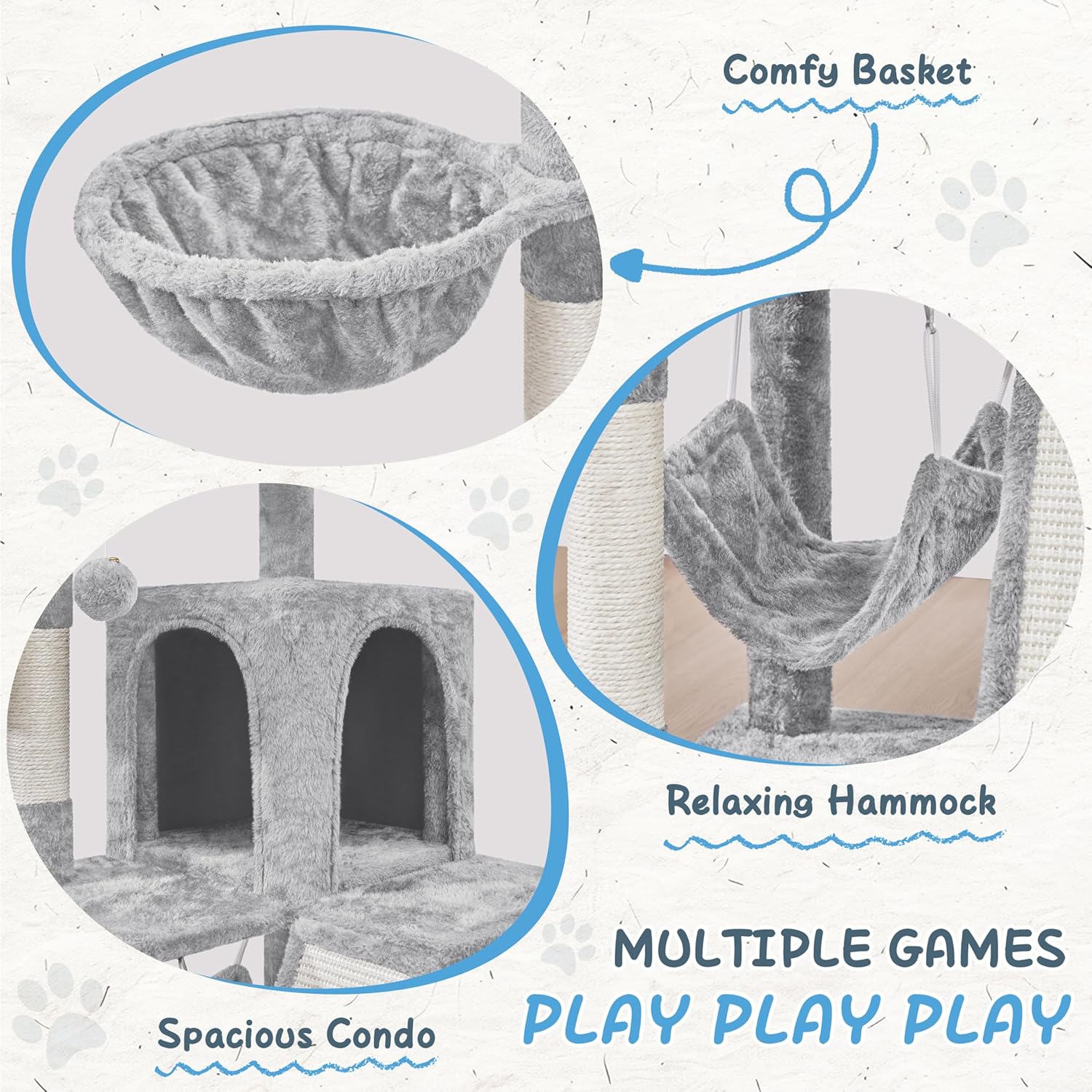 MULTI-FUNCTIONAL CAT ACTIVITY PLAYGROUND: Featuring a multilevel design, this cat tree is a good choice for any cat to play or rest. A top perch is suitable for viewing, a basket is good for lounging, a scratching board encourages feline friends’ active behavior, and a condo/hammock is good for sleeping. This multilevel cat tower provides a safe space for your cats to sleep or play when you are not home